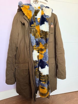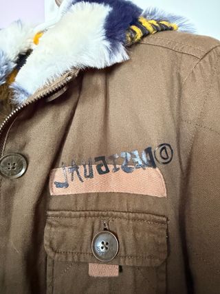 Parka de la marca Desigual en color verde militar. Cuenta con capucha y cordones ajustables en la cintura y el bajo para un mejor ajuste. Tiene uso pero está muy bien conservado. Talla: S Estilo parka militar Color verde oliva Forro interior de pelo muy cálido Capucha Cierre cremallera + botones Varios bolsillos Ajuste en cintura Muy cómodo y resistente. Perfecto para invierno, frío o uso diario. Se puede ver sin compromiso y es algo negociable.