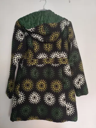 Abrigo con un diseño llamativo y capucha. - Estampado circular multicolor sobre fondo negro. - Interior forrado y acolchado en color verde. - Cierre de cremallera frontal.