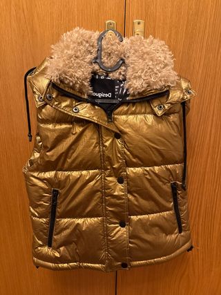 Chaleco acolchado con un llamativo acabado metalizado y un suave cuello de pelo sintético. - Cierre de cremallera frontal. - Bolsillos laterales con cremallera. - Detalle de botones a presión en la parte frontal.