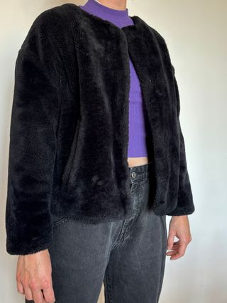 Abrigo de felpa y borreguito en color negro de Zara, perfecto para el invierno. Su tacto es muy suave y agradable. Es una talla L de mujer equivalente a una M de hombre - Cierra con un solo botón de izquierda a derecha - Bolsillos laterales
