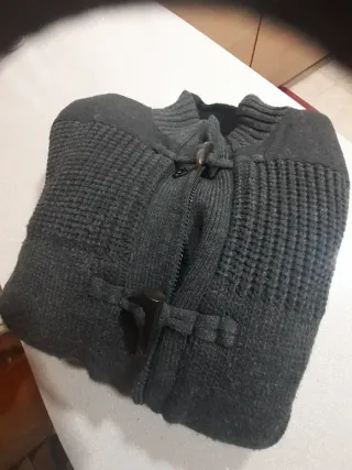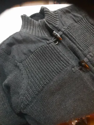 Chaqueta de punto gruesa, ideal para el otoño y el invierno. Cuenta con un suave forro interior de felpa para mayor calidez. - Cierre de cremallera. - Cuello alto acanalado. - Detalle de botones tipo toggles en la parte frontal. - Paneles texturizados en el tejido. Apenas usada dos puestas. Vendo por quedar grande.