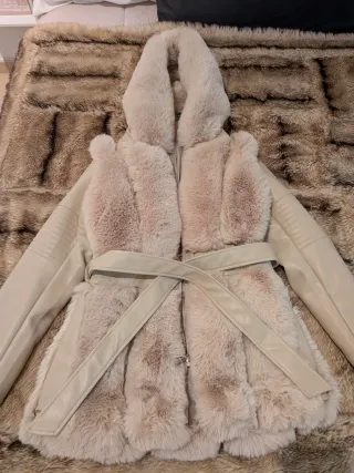 Abrigo elegante con detalles en polipiel y tela. - Diseño con cinturón para ajustar. - Acabado suave y cálido.