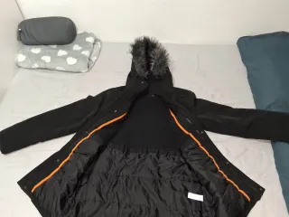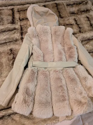 Parka de invierno con capucha y detalles de pelo. - Cierre de botones y cremallera. - Bolsillos laterales con cremallera. - Diseño acolchado. - Felpa suave en el interior - Con cinturón Es muy comoda, no pesa y abriga. Excelente prenda. En perfecto estado.