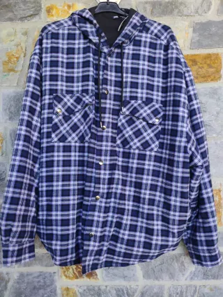 Chaqueta de cuadros con forro interior de guata, ideal para el frío. Es una prenda sin estrenar. - Diseño a cuadros en tonos azules y blancos. - Cierre de botones. - Dos bolsillos en el pecho con solapa y botón. - Capucha con cordones ajustables.