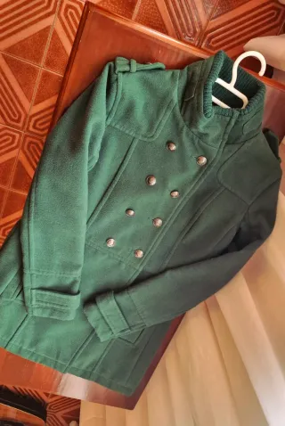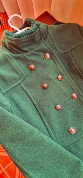 Abrigo de felpa de corte tres cuartos. - Color verde abeto. - Diseño de doble botonadura. Dos botones hay que coserlos. - Cuello alto con acabado de canalé. - Hombreras decorativas.