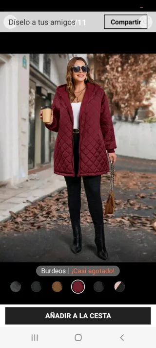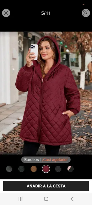 Abrigo acolchado de color granate, con forro interior de felpa para mayor calidez. - Diseño acolchado. - Cierre de cremallera. - Capucha integrada.