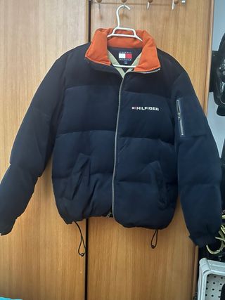 Chaqueta plumífera de Tommy Hilfiger con un diseño moderno y llamativo. - Combinación de colores azul marino y naranja. - Cuello alto con forro de felpa naranja. - Bolsillos laterales con cremallera. - Logo de Tommy Hilfiger en el pecho.