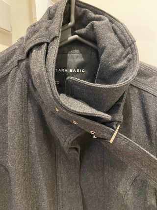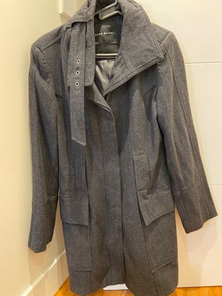 Abrigo de felpa de mujer Forrado de tela por dentro Con bolsillos Sin cinturón a la cadera Cierre con botones Cuello alto Altura por debajo del culo Color gris oscuro Marca Zara Talla M