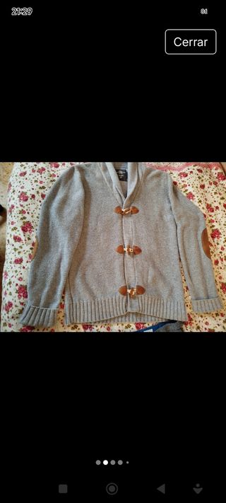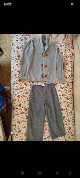 La chaqueta es de punto, talla M, marca H&M, es de color gris con las coderas y las partes que sujetan los cordones que van con trabillas de madera, en color marrón, está muy poco usada pero se escapó un punto que ya está cogido y que ni se nota, pero que es de ley que diga, se pueden ver las fotos; la falda-pantalon es talla M, marca Suite Blanco, es de color gris y de tela que si no es felpa, es muy parecida, calentita y muy poco usada también.