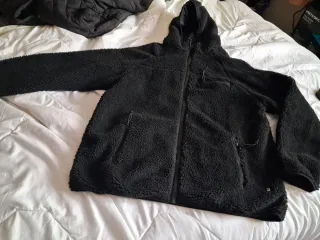 Abrigo Negro de felpa nuevo,usado una ves ,con los puños y cuello de poner y quitar talla 44.