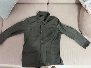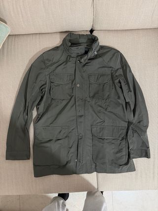 Chaqueta de estilo funcional con múltiples bolsillos. - Cierre de cremallera y botones. - Cuello alto con opción de ajustarlo. - Detalle de hombreras. - Bolsillos en el pecho y en la parte inferior.