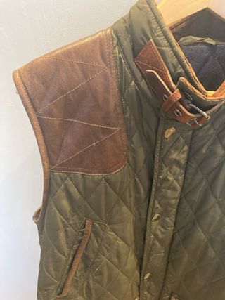 Chaleco de la marca Hackett en tonos verde y marrón.en la ultima foto se ve un pequeñisimo descosido muy facil de solucionar - Diseño acolchado. - Detalles en cuero en hombros y bolsillos. - Cuello alto con cierre de hebilla.