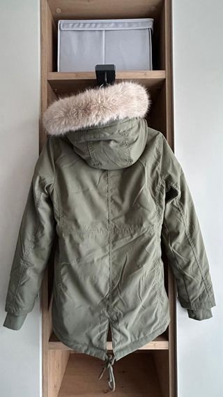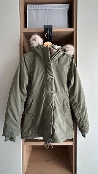 Abrigo de la marca Hollister en color verde. - Capucha con detalle de pelo. - Cierre de botones. - Bolsillos frontales. - Borriguito al interior