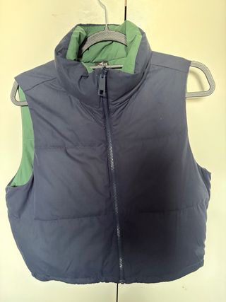Chaleco reversible de la marca Hollister en muy buen estado. Un lado es azul marino y el otro verde. - Diseño acolchado. - Cuello alto. - Cierre de cremallera frontal.