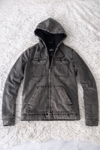 Chaqueta tejana de la marca Hollister, con mangas de sudadera gris y con capucha.