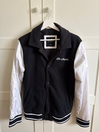 Chaqueta estilo bomber de la marca Hollister. - Cuerpo principal en color negro. - Mangas en color blanco. - Cuello estilo bomber. - Puños y bajo con detalles de rayas.