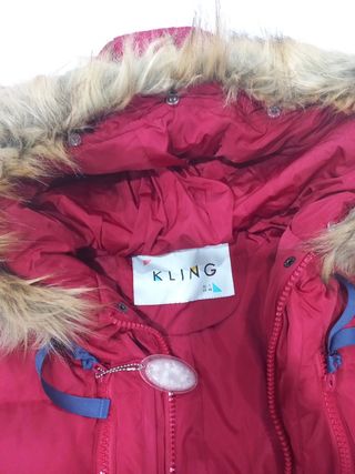 Abrigo de la mítica y ya no existente marca Kling. El abrigo está en perfecto estado, con puños y cremalleras muy bien cuidadas. Cuenta con pelo sintetico para la capucha, de quita y pon. Tiene dos botones descosidos y están pegados en la etiqueta. A penas usado