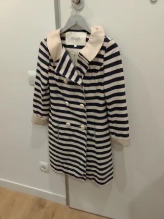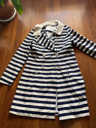 Gabardina con un diseño clásico de rayas marineras. Es una prenda versátil y elegante. - Cierre de doble botonadura. - Cuello camisero. - Bolsillos laterales. tiene algún roce del uso de bolsos como se ve en la segunda foto