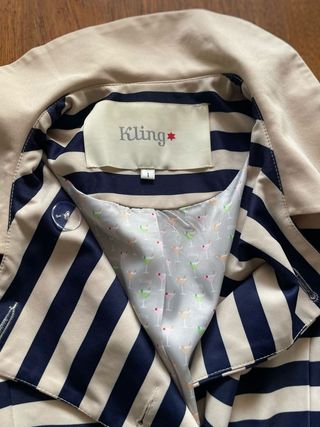 Trench estilo marinero de la marca Kling. Un clásico renovado con un toque moderno. Prácticamente está nueva, puesta literalmente 2 veces - Diseño de doble botonadura. - Cinturón a juego con detalles de rayas. - Puños con detalles de rayas. - Detalle de charm amarillo en forma de K.