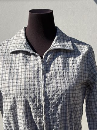 Chaqueta dos texturas: en el pecho es impermeable. Cierre con cremallera. Lleva bolsillos. Algún desperfecto en cuello y manga (ver fotos). Largo total: 67cm Ancho total: 51cm
