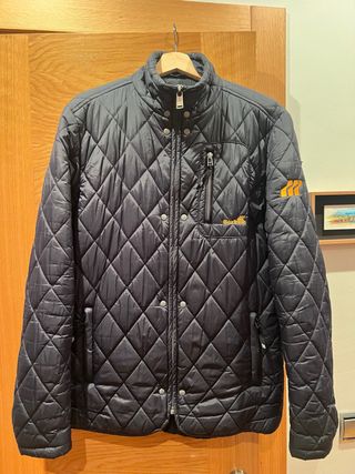 Chaqueta acolchada tipo barbour, azul marino. Es talla S amplia (como una M) para altura 170-175cm - Cálida e impermeable - Cierre de cremallera - 3 bolsillos con cremallera (uno en pecho) y otro interior - La parte trasera es un poco mas larga que delante - tiene un pequeño enganchón en manga izquierda. (Ultima foto, casi desapercibido)