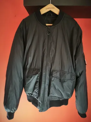 Vendo chaqueta estilo bomber de Pull & Bear en color negro, talla XL. Es una prenda muy versátil, ideal para el día a día o un look más urbano. Muy poco uso, sin roces ni desgaste en los puños o el cuello. Es una XL de Inditex que sienta de maravilla. Como referencia, yo mido 1,86 m y me queda perfecta de largo y de mangas. Forro interior con tejido ripstop (antidesgarro) de alta resistencia. Bolsillo con cremallera en la manga izquierda y parche decorativo original. Cierre frontal con cremallera de tirador circular y bolsillos laterales con solapa. Corte clásico con acabados elásticos en cuello, cintura y puños para un