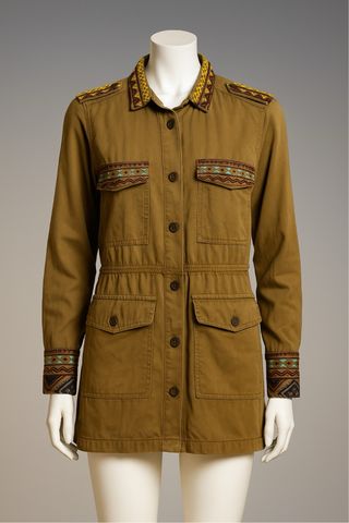 Sobrecamisa de Mango con un diseño único y detalles bordados. - Color caqui. - Talla M. - Adornos bordados en cuello, bolsillos y puños. Sobrecamisa de Mango en talla M, estilo militar con un toque boho gracias a los bordados étnicos en tonos vivos en cuello, hombros, puños y bolsillos. Confeccionada en algodón resistente y suave, ideal para entretiempo o como chaqueta ligera. Combina fácilmente con jeans o vestidos para un look casual con personalidad. En excelente estado.