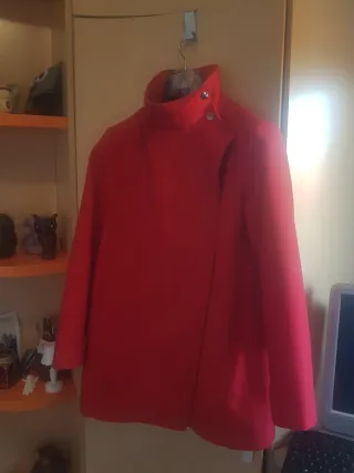 Abrigo corto de paño en color rojo. - Diseño de doble botonadura. - Cuello solapa. - Bolsillos frontales. Talla XL, de Easy Wear. Tiene las mangas arregladas para alargarlas aunque pieden volver a su forma original. Muy calentito. En muy buen estado.