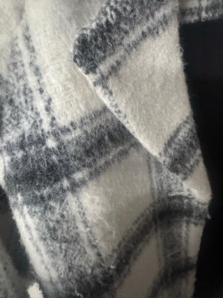 Abrigo de la marca Klasiks con un diseño a cuadros. - Diseño a cuadros en gris, negro y blanco. - Con capucha. - Cierre de botones. - Bolsillos laterales. Usado en un par de ocasiones pero en perfecto estado. En la parte posterior de las mangas algo más desgastado del roce al haberlo guardado en armario junto con otras prendas .