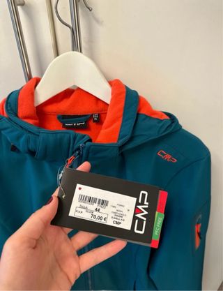 Chaqueta técnica CMP con un llamativo forro interior naranja. - Color principal verde azulado. - Cremallera frontal completa. - Bolsillos laterales con cremallera. - Logo de CMP en el pecho y en la manga.