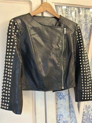 Cazadora de polipiel con un diseño moderno y atrevido. - Detalle de tachuelas plateadas en mangas y hombros. - Cierre asimétrico con cremallera. - Cuello redondo.