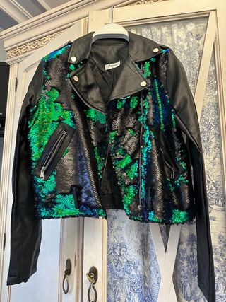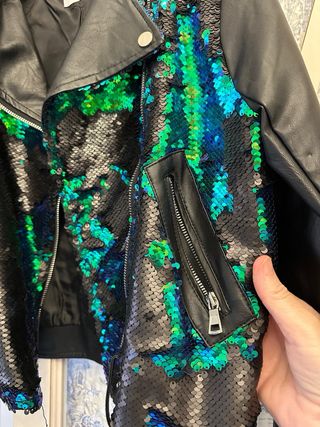 Cazadora de polipiel con detalle de lentejuelas brillantes. - Mangas y parte trasera de polipiel. - Delantero adornado con lentejuelas reversibles. - Cremalleras decorativas y funcionales.