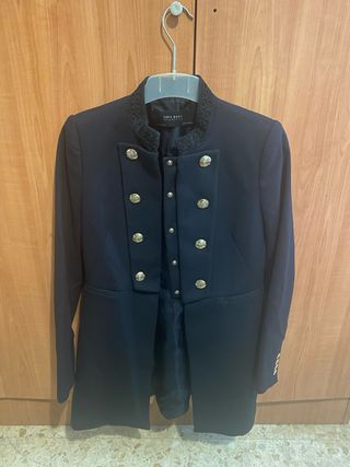 Elegante chaqueta de paño de Zara con un diseño militar. - Doble abotonadura frontal. - Botones metálicos dorados. - Detalle de cintas en los puños. - Cuello solapa.