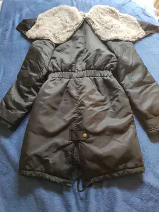 Parka de la marca Zara con forro interior de pelo sintético azul. - Color exterior verde militar. - Cierre de cremallera y botones. - Capucha con pelo sintético. - Bolsillos frontales.
