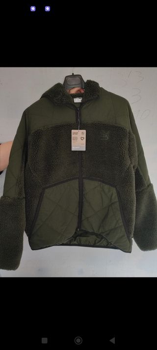 Vendo abrigo con capucha de la marca Puma acolchado con el logo oficial en el pecho de la marca con cremallera y bolsillos laterales color verde militar talla M está nueva sin estrenar con la etiqueta.
