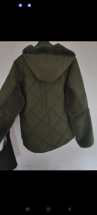 Chaqueta anorak estilo militar de color verde oliva. Es de la talla M. Tiene muy poco uso.Esta como nueva. - Tiene un cuello de borreguillo. - Incluye dos bolsillos delanteros. - Lleva parches con detalles militares.