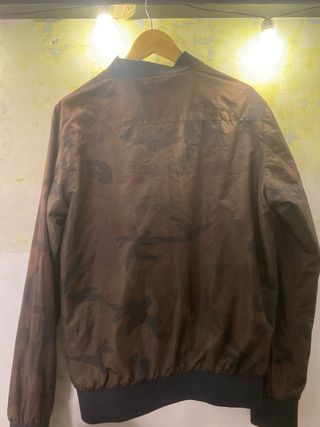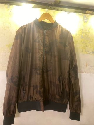 Chaqueta bomber con estampado militar. Está en buen estado. - Diseño bomber clásico. - Estampado de camuflaje en tonos verdes y negros. - Cremallera frontal.