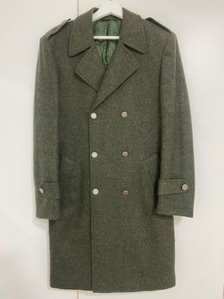 Abrigo largo de estilo militar en color verde. Presenta un diseño de doble botonadura y solapas clásicas. - Cuello con solapas anchas. - Cierre de doble botonadura con botones plateados. - Hombreras. - Puños ajustables con botones.
