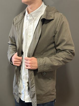 Abrigo de hombre con forro interior cálido. - Color verde militar. - Cierre de cremallera y botones. - Capucha ajustable. - Bolsillos frontales.