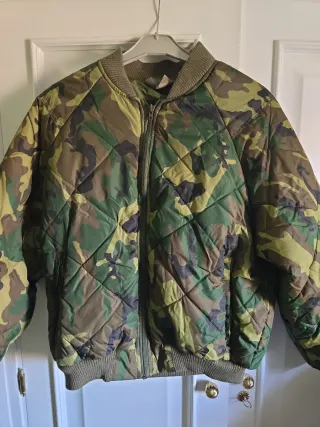 Chaqueta bomber militar sin ningun uso, de 1990, pone en la etiqueta talla 4, yo mido 1.84 y me esta algo corta, asique andara por uns talla L. Diseño acolchado con cuello y puños elásticos. - Cierre de cremallera frontal. - Bolsillos laterales. - Tejido resistente.