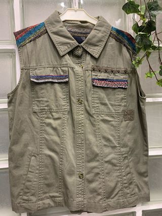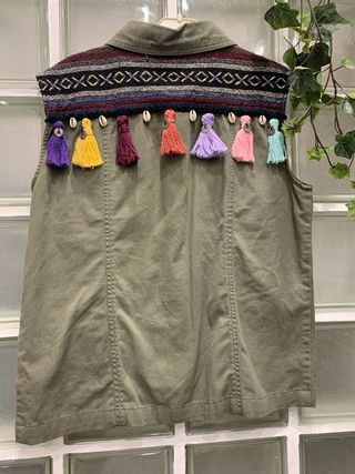 Chaleco de estilo militar en color verde, con detalles bordados en hombros y bolsillos. - Diseño sin mangas. - Cierre de botones. - Bolsillos frontales con adornos. - Flecos en la espalda