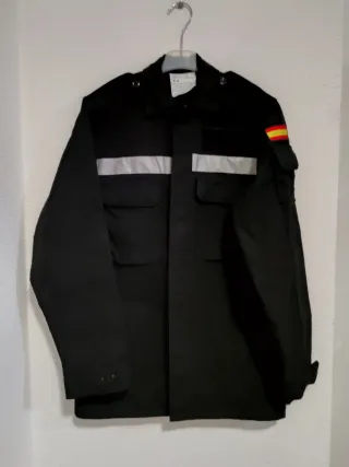 Chaqueta negra de la Unidad Militar de Emergencias (UME). Medidas largo 77 cmts De axila a axila 51 cmts Talla 2G - Bandera de España en la manga. - Bandas reflectantes en pecho y espalda. - Dos bolsillos frontales con solapa. - Cierre de botones. - Puños con botón.