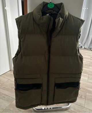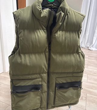Chaleco acolchado de color verde militar, ideal para añadir una capa extra de abrigo. - Diseño sin mangas. - Cierre frontal con cremallera. - Dos bolsillos delanteros con cremallera.