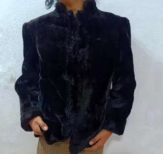 Elegante chaquetón de mouton auténtico (mutón). Confeccionado a medida. - Color negro intenso. - Diseño clásico con cuello. - Cierre frontal. - Bolsillos laterales exteriores. Medidas: 86cm largo x 60cm ancho en cintura 48cm ancho en pecho Manga desde hombro 52cm, desde sisa 40cm