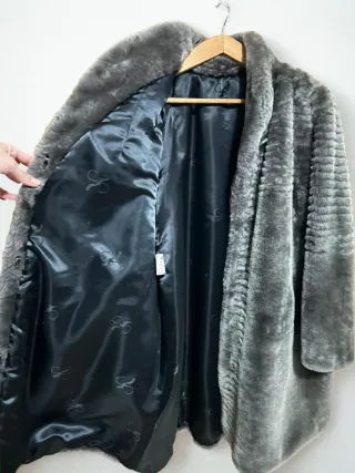 Abrigo de pelo sintético con efecto Mouton. En perfecto estado. Largo 85 cms. De sisa a sisa 55 cms y largo manga 52 cms. - Color gris oscuro. - Talla M.