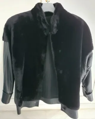 Elegante chaquetón de mouton y piel con un diseño moderno. - Diseño en espiga. - Cierre de cremallera. - Cuello alto. Para tallas 38, 40 y 42 Medidas: Hombro a hombro: 44 cm Sisa a sisa: 54 cm Largo chaquetón: 65 cm Largo manga: 62 cm