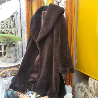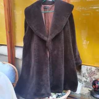 Talla 44-46. Color marrón oscuro. En el borde de las mangas lleva un trozo de piel de pelo en negro. Dos bolsillos laterales disimulados. Largo aproximado 1 metro. Se puede lavar en seco. Está en muy buenas condiciones. No hago envíos.