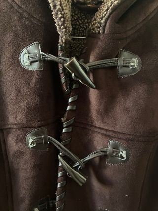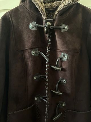 abrigo Conbipel estilo mouton/borreguito en color marrón chocolate, muy cálido, cómodo y favorecedor. Diseño tipo duffle coat con cierre de botones tradicionales de cuerno y costuras decorativas. Marca: Conbipel (Italia) • Color: marrón oscuro • Corte: recto ligeramente evasé (queda estilizado) • Capucha amplia para proteger del frío • Interior forrado en borreguito cálido y suave • Exterior efecto ante (tacto muy agradable) • Detalle de costuras decorativas tipo artesanal • Cierres tipo trenca (toggle) clásicos y resistentes