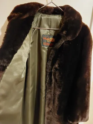 Abrigo de piel auténtica de mouton · Cirilo Fernández · Vintage años 60 • Color marrón chocolate, tacto terciopelo, sin calvas ni zonas secas. • Forro satinado color gris con 2 roturas en costura (faciles de arreglar): 15 cm y 12 cm (ver fotos). Solo forro, la piel perfecta. • Es abierto, no tiene botones. • Peso: 2 kg. • Medidas aprox. - Hombro a hombro: 40 cm - Pecho (sisa): 55 cm → contorno 110 cm - Largo manga: 60 cm - Largo total: 100 cm Precio negociable