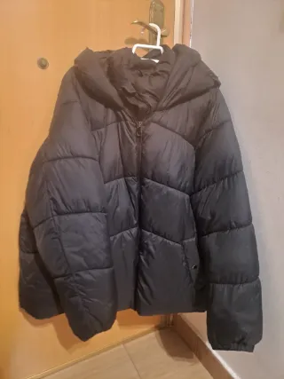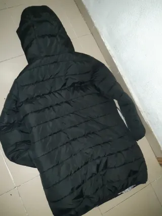 Abrigo acolchado de color negro, ideal para mantenerte abrigado. Un pequeño roto por dentro en un lateral se rozó sin querer con una pedrería de unos pantalones que llevaba. Corchetes en los bolsillos. - Diseño acolchado. - Cierre de cremallera. - Capucha integrada.